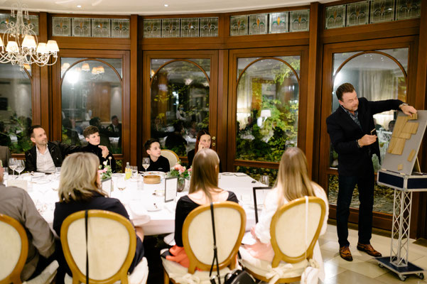 Ob Messe, internes Firmenevent oder glanzvolle Gala: Mit meiner mobilen Tischzauberei und spektakulären Close Up Zauberei bringe ich die Show direkt zu Ihren Gästen. Während die Kunststücke zwischen den Tischen passieren, fühlen sich Menschen jeden Alters angesprochen, und das Publikum wird Teil der Magie – näher dran geht nicht. Der Spaß für das Publikum beginnt oft schon im Foyer, wenn der Zauberkünstler als Zauberer witzige Close Up Tricks vorführt und damit die Atmosphäre auflockert.